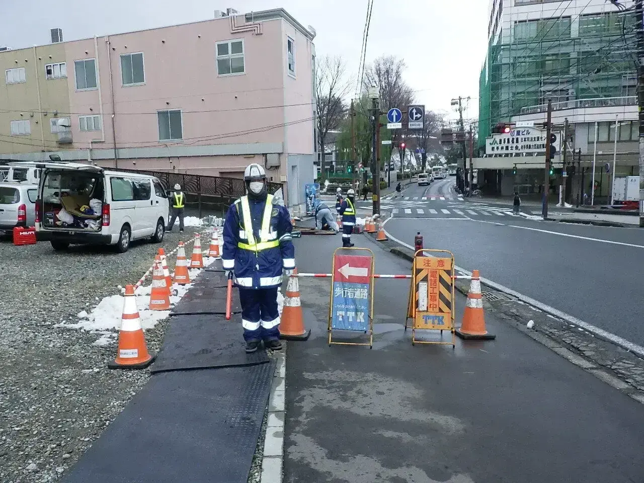 昭和建設工業では警備業も実施しており、人や車が行き交う場所や危険が伴う現場で、事故・ケガの発生を未然に防いでいます。人々の命を守る大切な仕事であり、作業現場には欠かせない存在でもあります。